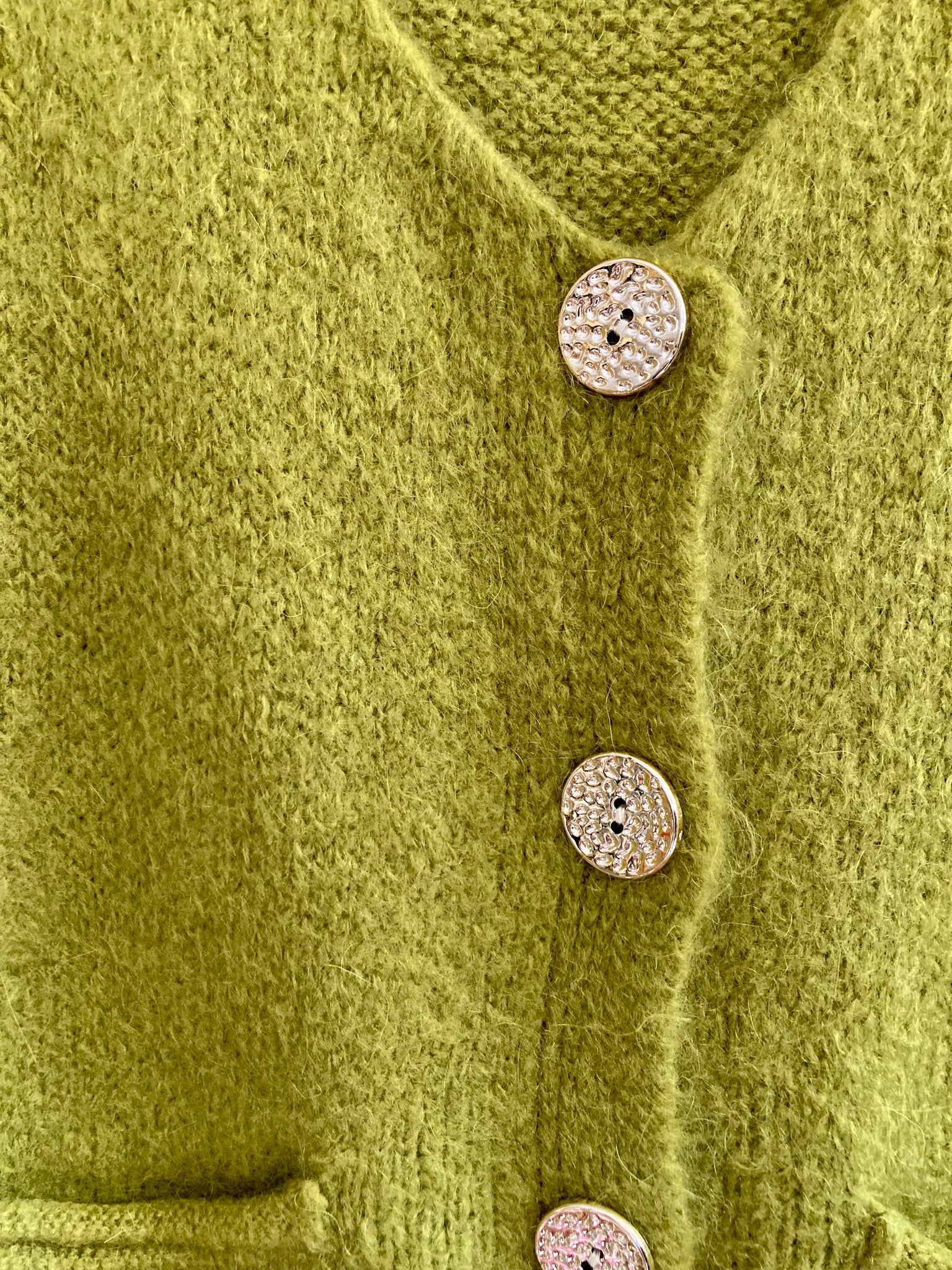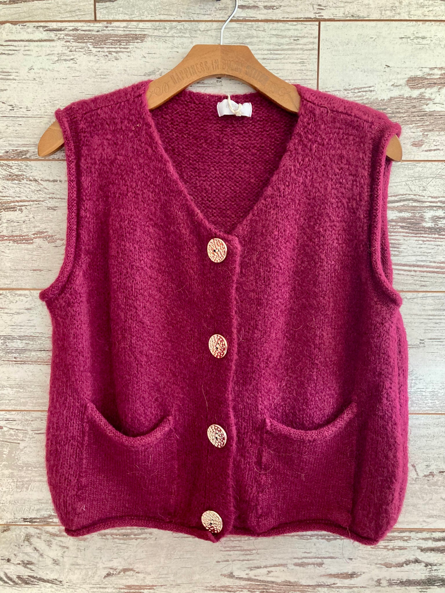 Cute knitted waistcoat with gold buttons and two little front pockets. Two fabulous to choose from, Kiwi green and Berry.