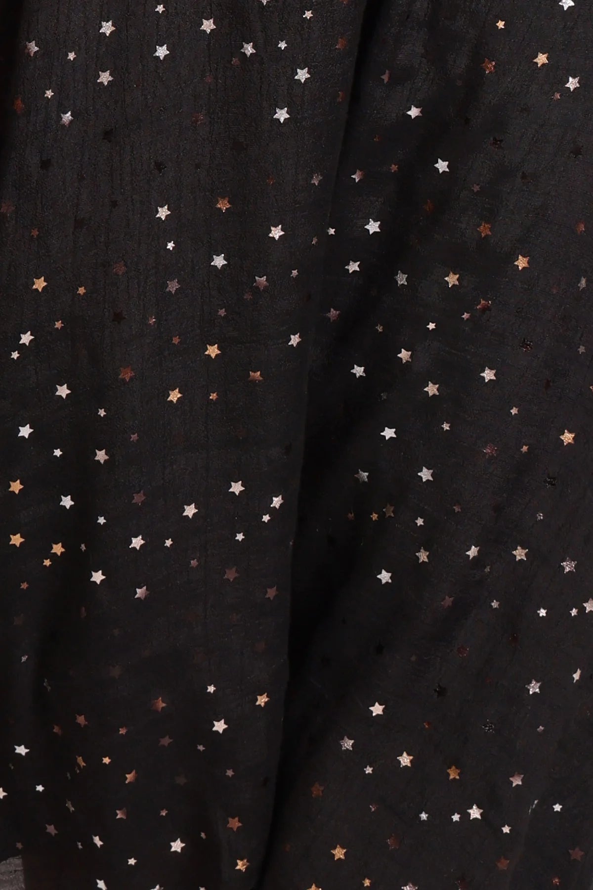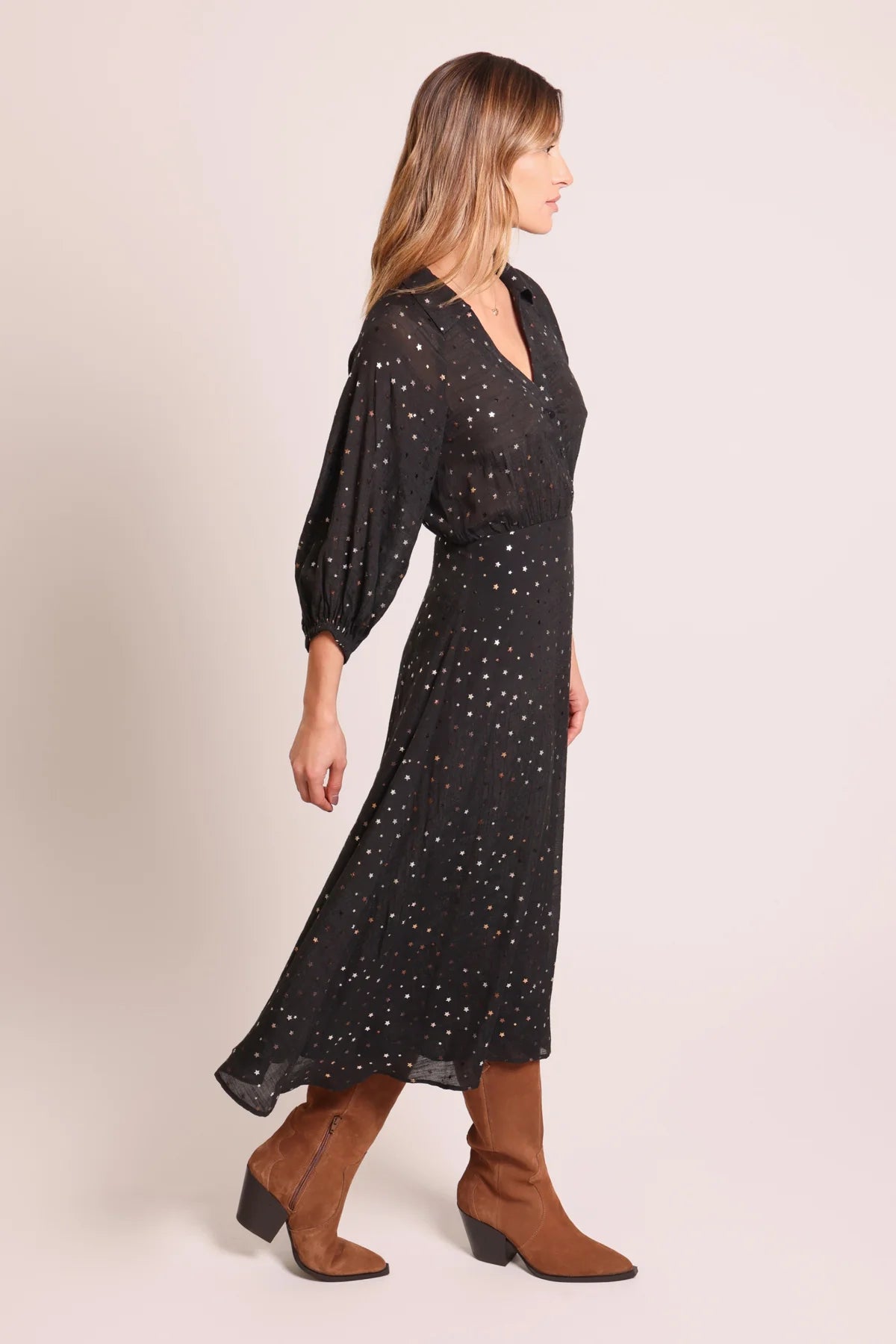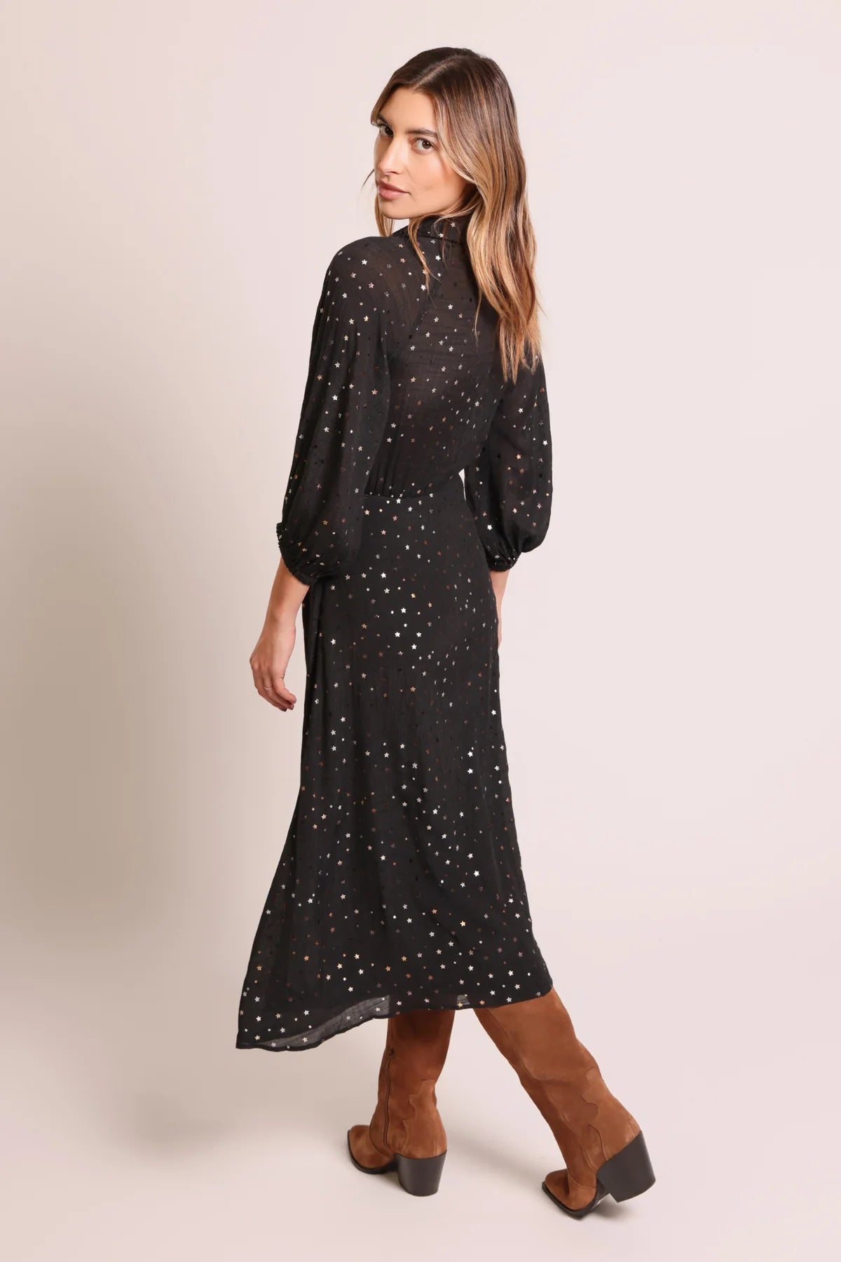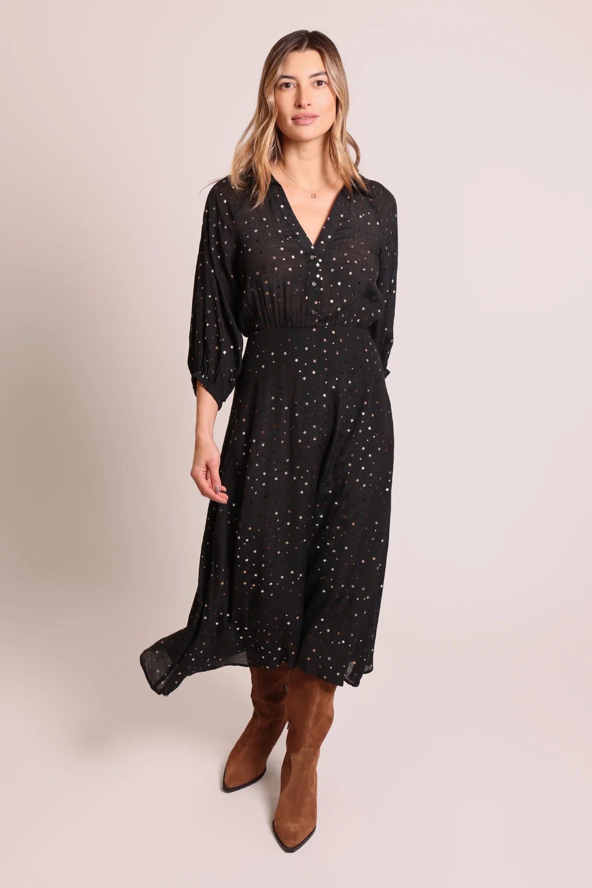 The Fusion dress is a simple midi dress with a classic V-neck shirt collar and an elasticated waistband to give the most flattering silhouette. It has 3/4 sleeves with elasticated cuffs and side pockets. Versatile, but unique in this black and metallic star print fabric.