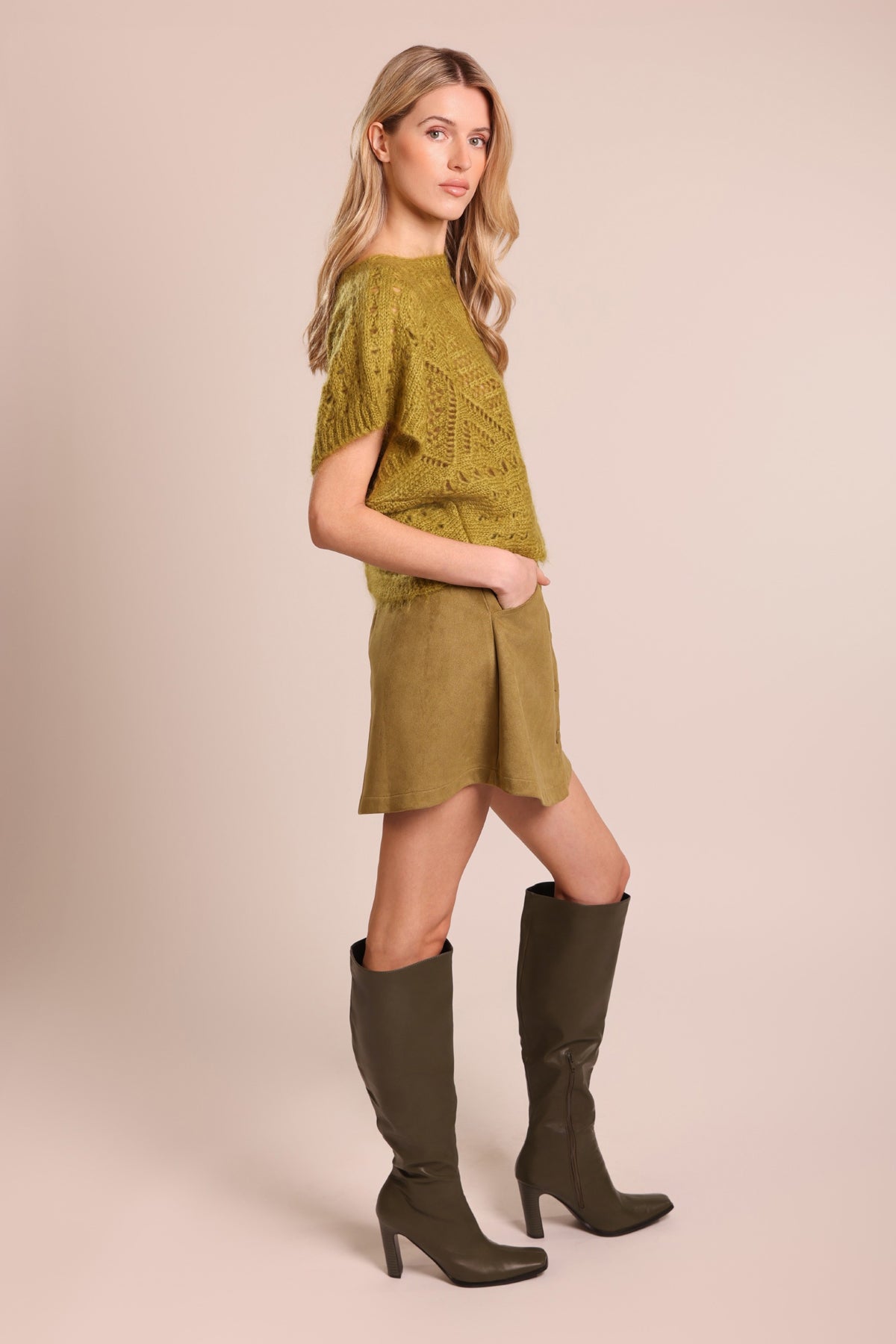 A boxy boatneck knit from Traffic People in the most gorgeous chartreuse green. A kimono style sleeve in a mohair mix.
