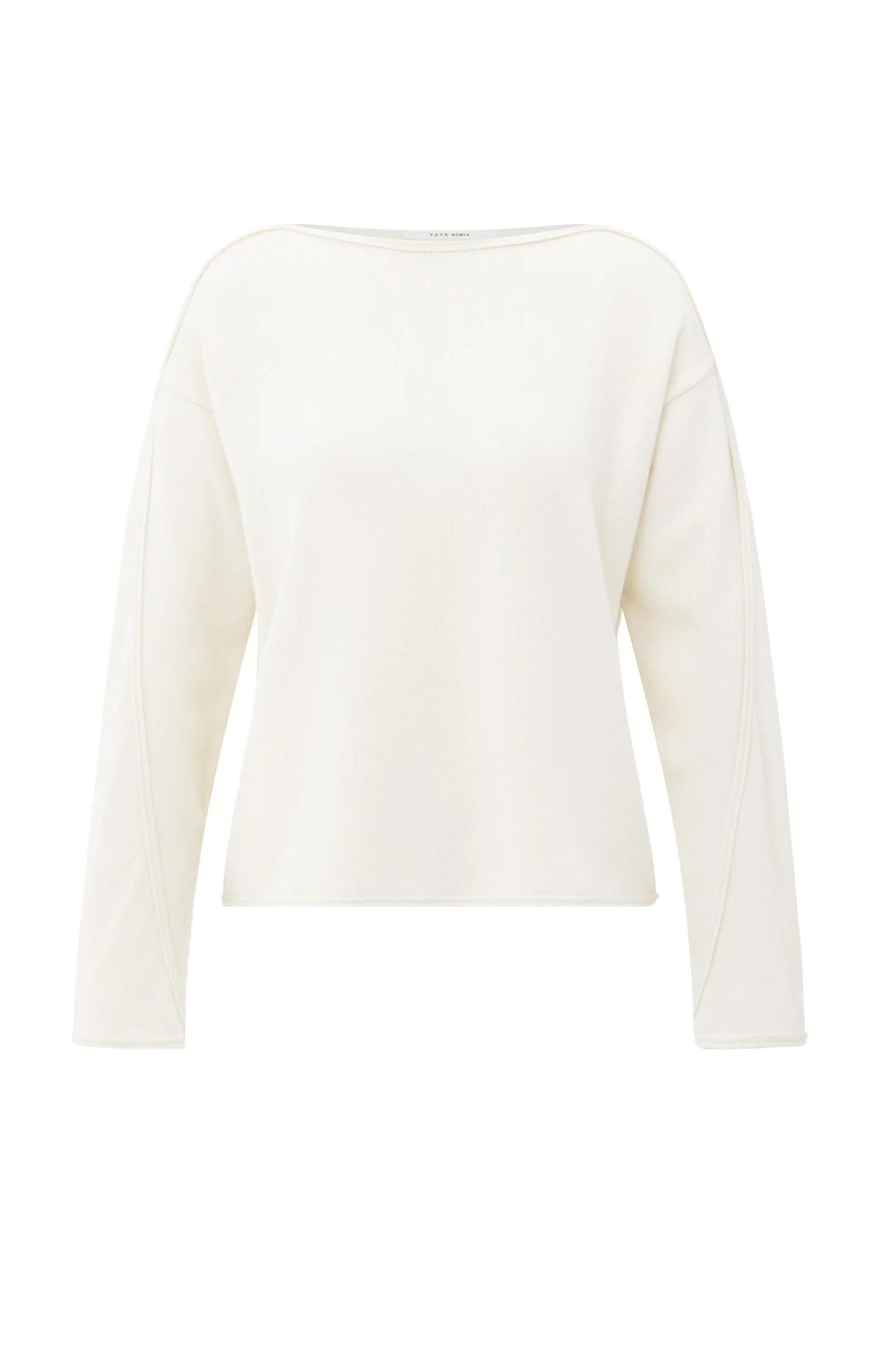 This finely knitted sweater features an elegant boat neckline, long sleeves, and a loose fit. The refined decorative seams along the sleeves add a subtle, stylish accent. Made from a soft and comfortable fabric, perfect for an elegant look.