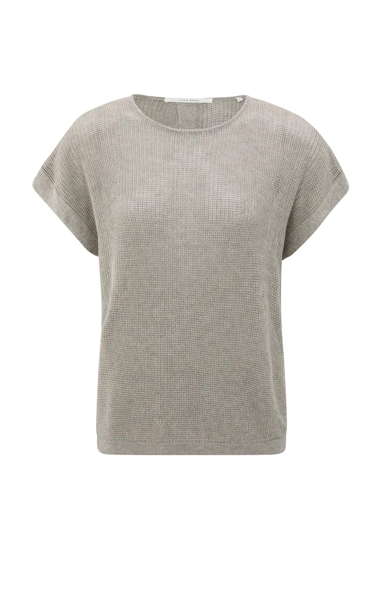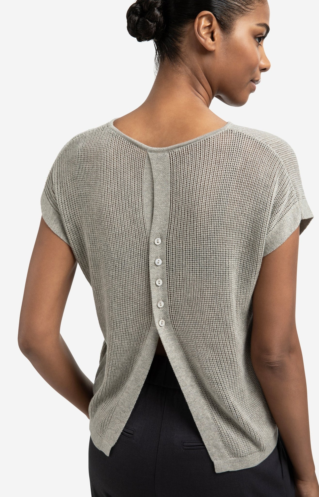 This sleeveless top is crafted from a breathable knit with a subtle waffle texture. It features a round neckline, regular fit, and cap sleeves. The button closure and split at the back add a playful and feminine twist. Wear it as a lightweight summer piece or layered for added dimension.